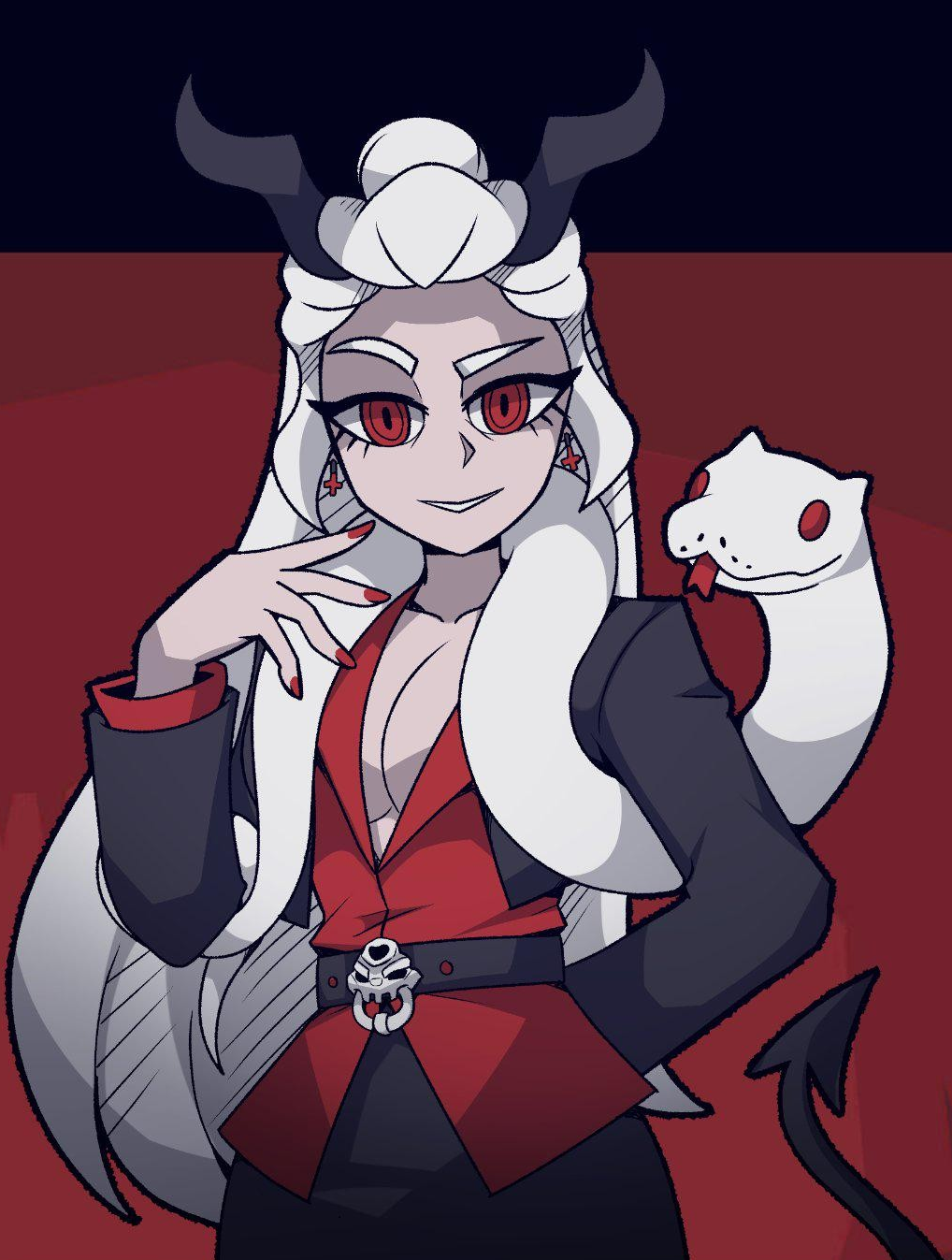 Lilith was the first wife of Adam who refuse to submit to Adam and stormed off and left the Garden of Eden and became the mother of demons/Mother of Succubus,Incubus and the supreme of Hell. She appears long white hair, black horns had pet of a white snake , Business like office clothing revealing her cleavage. pale skin , Devilish tail. Red eyes, red Nails.
