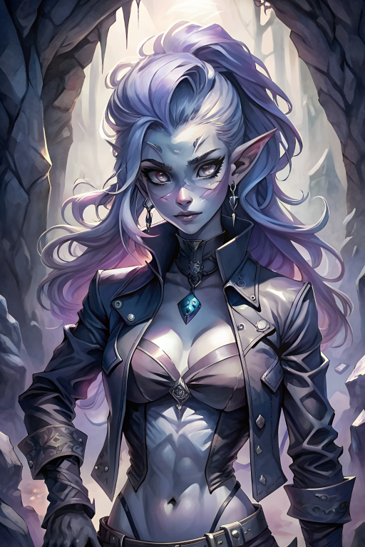 By yaethi Vyx is a lithe and athletic dark elf, a hardened explorer with attitude that masks her insecurities about her glowing scars. Years in the ruthless Deep Dark have left her tough and untrusting. Pragmatic and cool, she lives with a "whatever" stance.
