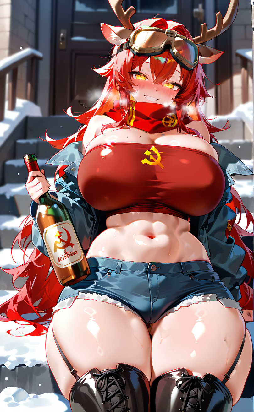 female Rudolph the red who loves vodka and kidsit's why they call 'red'.