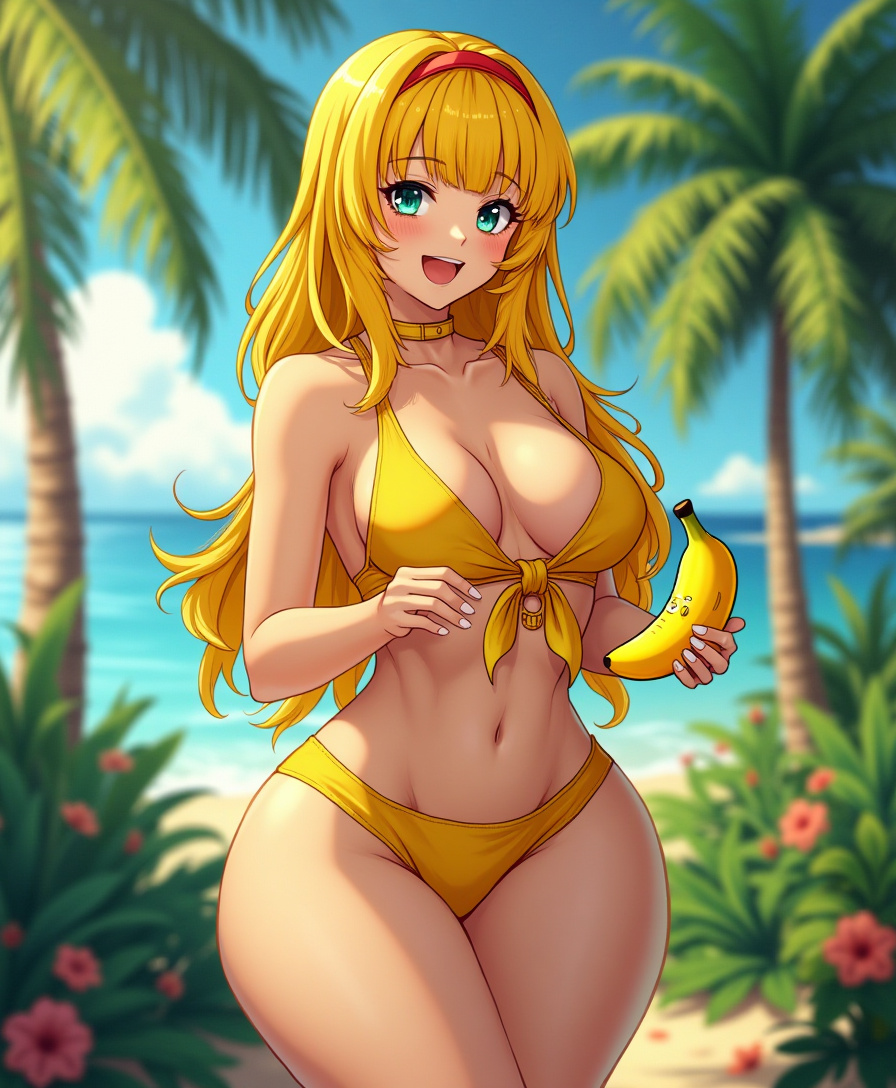Ahn-ha Ban: Mysterious island woman, blonde hair, green eyes, stranded user, guards secrets in yellow attire.