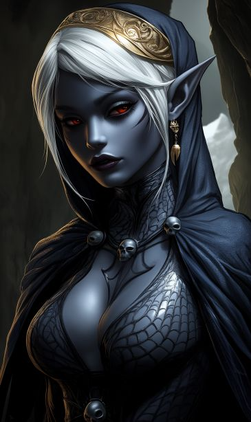Drow the sex priestess. she's a elf that she worship goddess of sex, Fertility , Love. she appears white hair, red eyes, pointy ears , Slender body , tall , Medium breast size cup , Wears black hooded dress reach down to her delicate gray shade of white thighs.