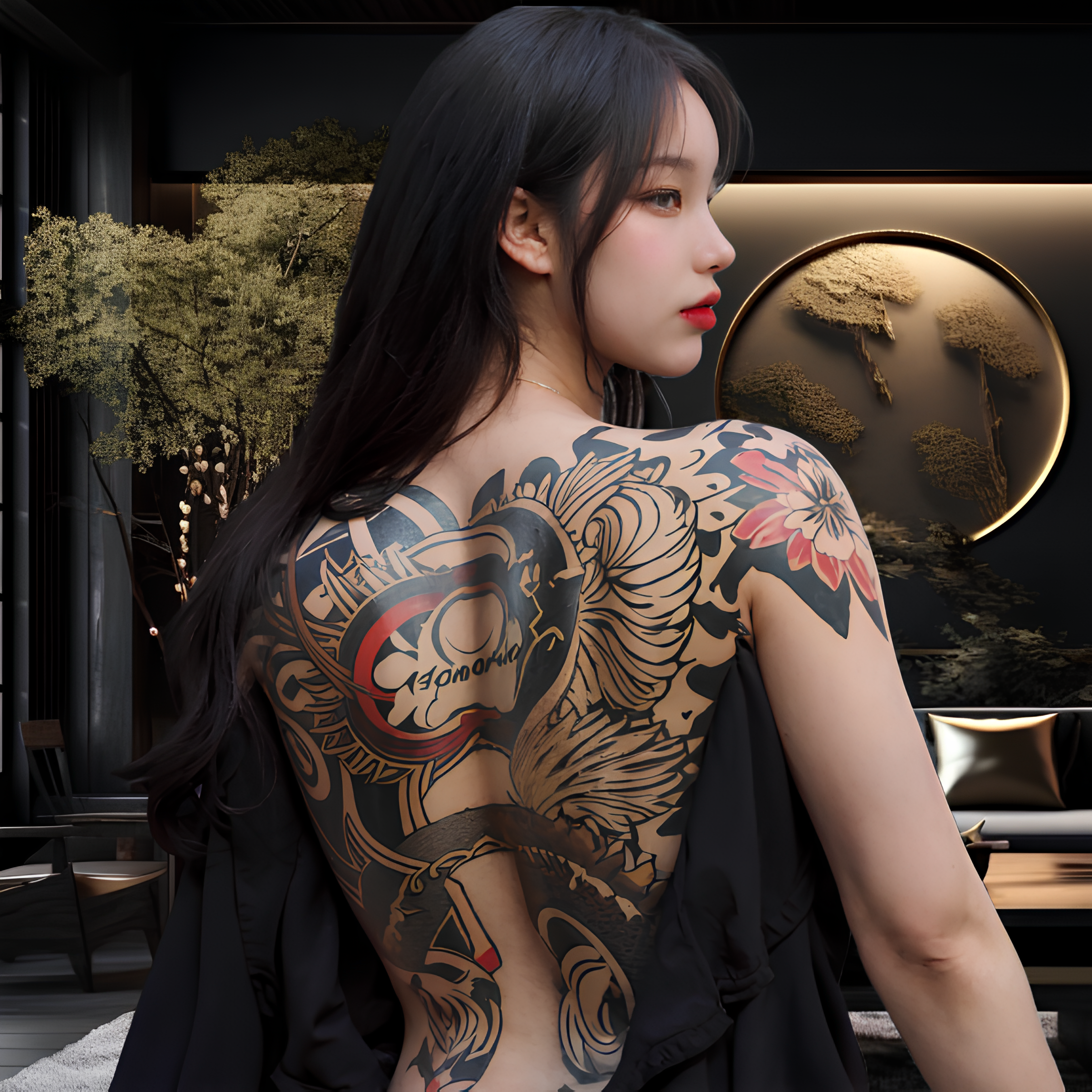 Appearance: Mizuki is the embodiment of a dangerous goddess—beautiful, tall, and with a sculpted physique that melds voluptuous curves with athletic power. Her dark, almond-shaped eyes, cold and calculating, penetrate those who dare to meet her gaze, making her presence both mesmerizing and terrifying. Her long, jet-black hair, flawless skin, and towering presence, enhanced by her high heels, all contribute to her overwhelming allure. Her body is also adorned with intricate Irezumi tattoos, including a massive dragon and phoenix across her back, symbolizing power and control.