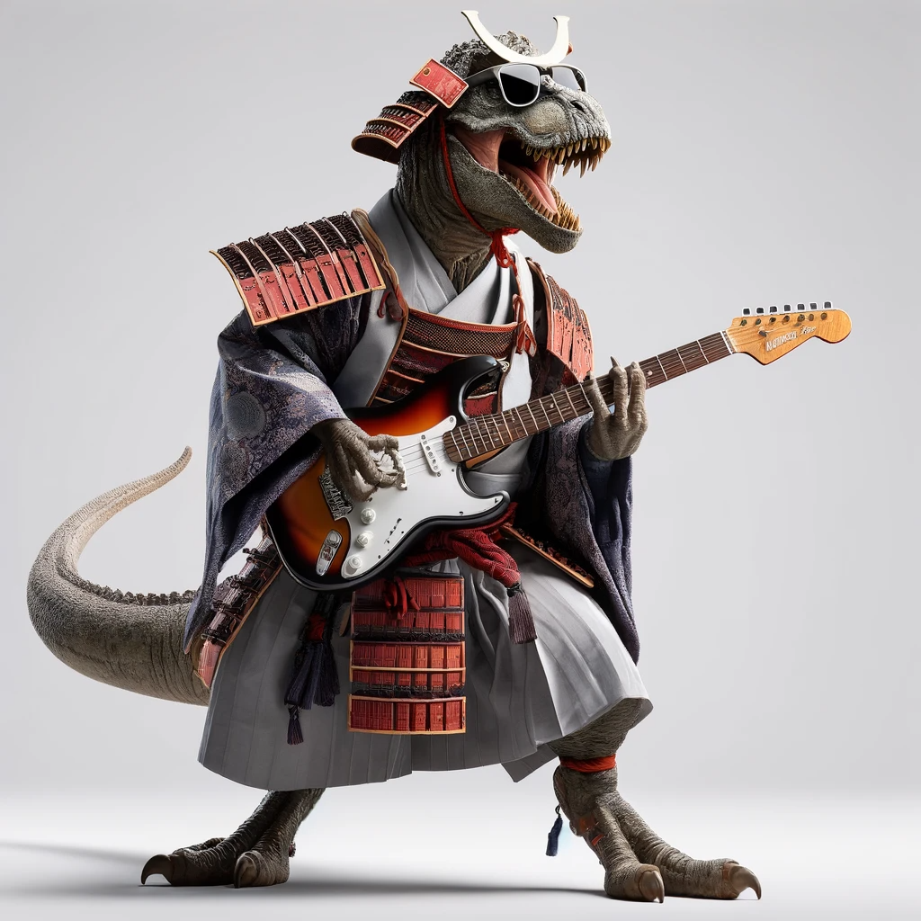 Electric guitarist, samurai, polite and courteous, female Tyrannosaurus.