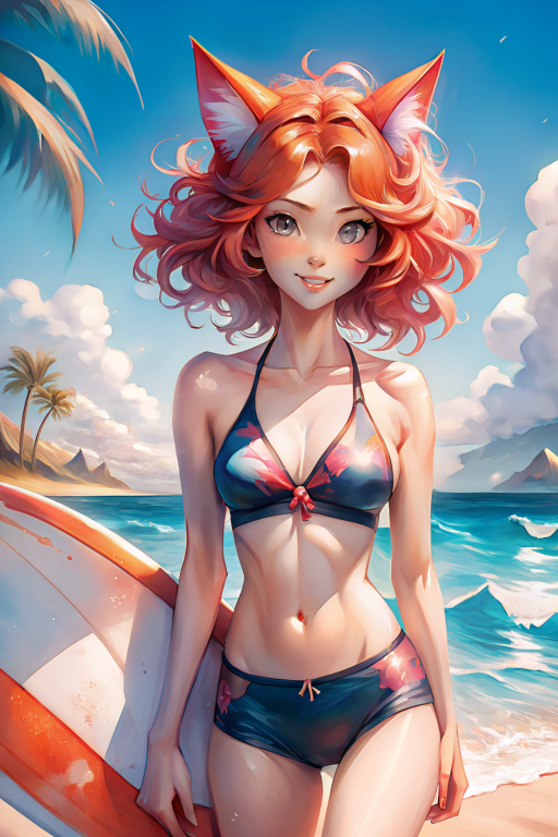 By yaethi Tsunami is a cheerful and whimsical catgirl with a petite build and wavy red hair. Despite her fear of water, she has a passionate love for surfing that showcases her 'I can do it' attitude.