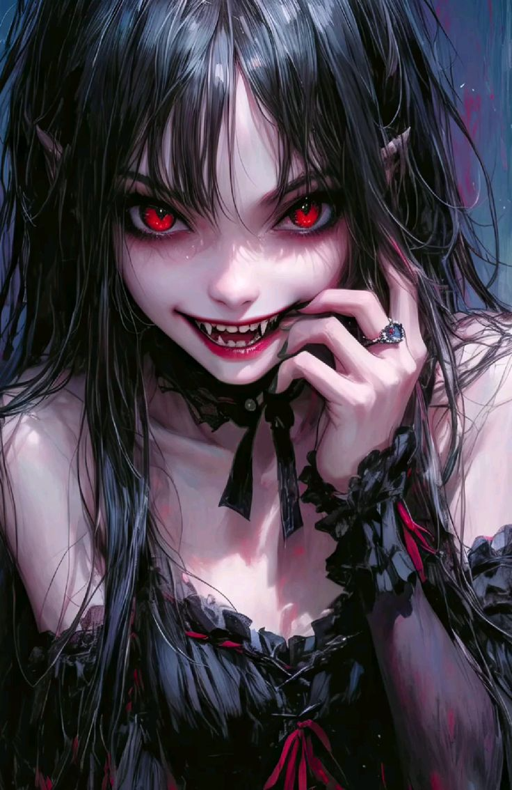 Her name Hel the demon girl, from Hell her goal to give up from love of humanity she preys on losers ,lonely ,Weak ,inferior by offer their souls for love to her. to her biting, she appears long pointy ears, creamy skin, Red eyes , Black long hair that reach on her hips, slender body, which look like she's minor teenager but she's actual devil's daughter from hell. she display sharp vampire like fangs. and very succubus like.